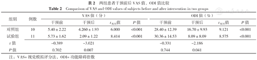 干预前两组VAS值、ODI值比较,差异无统计学意义(P>0.05)。试验组、对照组干预后VAS值、ODI值低于干预前,差异均有统计学意义(P<0.05);干预后试验组VAS值、ODI值低于对照组,差异均有统计学意义(P<0.05),见表2。