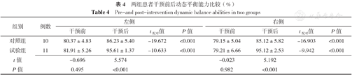 干预前两组左侧、右侧YBT得分比较,差异无统计学意义(P>0.05);试验组与对照组干预后左侧、右侧YBT得分高于干预前,差异均有统计学意义(P<0.05);干预后试验组左侧、右侧YBT得分高于对照组,差异均有统计学意义(P<0.05)。见表4。