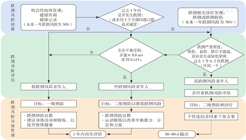高跌倒风险老年人存在严重跌倒损伤或多种跌倒风险因素,医护工作者应在二级预防的基础上,积极治疗跌倒损伤,并结合多因素跌倒风险评估结果制定个性化跌倒干预方案。