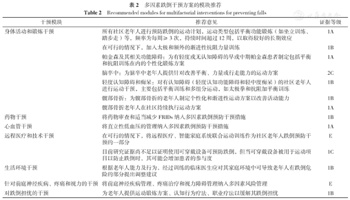 | 生活环境干预 | 根据老年人能力及行为,经过训练的临床医生应对其家庭环境中可导致老年人有跌倒危险的部分提出调整建议 | 1B |