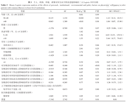 Binary Logistic regression analysis of the effects of personal,institutional,environmental and policy factors on physicians' willingness to refer patients with common illnesses to lower level institutions
