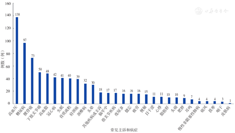 此外,问卷还对受访老年人经常受到困扰的健康问题进行了调研,调查结果显示242例受访老年人常见的主诉和病症为:高血压(138例,57.0%)、糖尿病(97例,40.1%)、腰背痛(73例,30.2%)、下肢关节痛(50例,20.7%)及高血脂(48例,19.8%),见图1。