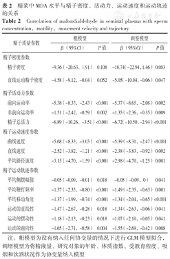 MDA水平与精子质量各参数的相关性上,粗模型结果显示,在精子活动力方面,MDA水平与PR、NP、精子总活力呈负相关(P<0.05);在精子运动速度方面,MDA水平与VCL、VSL、VAP呈负相关(P<0.05);精子运动轨迹方面,MDA水平与精子ALH、BCF、MAD、LIN、WOB、STR呈负相关(P<0.05)。在调整了研究对象的年龄、学历、BMI、吸烟、饮酒和精液量差异后,精子密度方面,MDA水平与直线运动精子密度呈负相关(P<0.05),其余结果均与粗模型结果一致。MDA水平与精子质量各参数的关系详见表2。