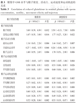 GSH水平与精子质量各项参数相关性上,粗模型结果显示,在精子密度方面,GSH水平与精子密度和直线运动精子密度呈正相关(P<0.05);在精子活动力方面,GSH水平与PR、精子总活力呈正相关(P<0.05);在精子运动速度方面,GSH水平与精子VSL、VAP呈正相关(P<0.05);精子运动轨迹方面,GSH水平与精子ALH、BCF、MAD、LIN、WOB、STR呈正相关(P<0.05)。在调整了研究对象的年龄、学历、BMI、吸烟、饮酒和精液量差异后,在精子密度参数方面,GSH水平与精子密度无相关性(P>0.05),其余结果均与粗模型一致。GSH水平与精子质量各项参数的关系详见表3。