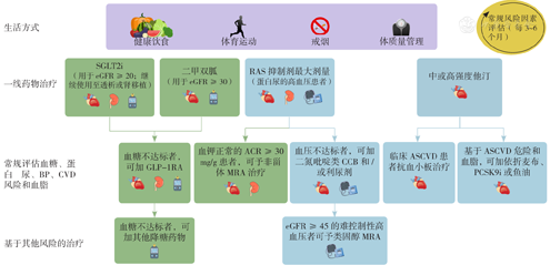 共识声明:所有T1DM或T2DM合并CKD患者应采取综合策略进行治疗,该计划由医疗保健专业人员和患者共同制定,在优化营养、运动、戒烟和体质量基础上,进行分层循证药物治疗,旨在保护器官功能,并控制血糖、血压和血脂水平达标。