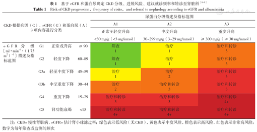 | eGFR分级〔ml·min-1·(1.73 m2)-1〕描述及指标范围 | G1 | 正常或升高 | ≥90 | 筛查1 | 治疗1 | 治疗和转诊3 |