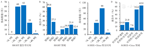 注:A为RIGHT报告率区间分布(%),B为RIGHT各领域报告率,C为AGREE-China得分区间分布,D为AGREE-China各领域报告率;领域1为基本信息,领域2为比较,领域3为证据,领域4为推荐意见,领域5为评审和质量保证,领域6为资金资助与利益冲突声明和管理,领域7为其他方面;RIGHT=国际实践指南报告规范,AGREE-China=中国临床指南评价体系