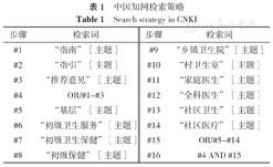检索了中国知网(CNKI)、万方数据知识服务平台(Wanfang Data)、中国生物医学文献服务系统(SinoMed)和维普网(VIP)建库至2021- 12-31的基层指南,并补充检索国家卫生健康委员会官网(http://www.nhc.gov.cn/),同时也追溯纳入文献的参考文献。检索词包括:"指南""指引""推荐意见""基层""初级卫生服务""初级卫生保健""初级保健""乡镇卫生院""村卫生室""家庭医生""全科医生""社区卫生""社区医疗"。具体检索策略以CNKI为例,见表1。
