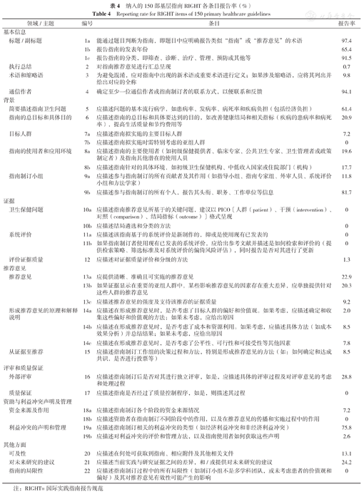 报告质量方面:RIGHT平均报告率为23.6%(11.4%~42.9%),多数基层指南〔123 (82.0%)〕报告率集中于10%~30%;7个领域中基本信息(59.8%)报告率较高,其余领域报告率均较低,其中证据(0.3%)报告率最低,见图3。各条目报告率从0到97.4%不等,报告率较高的条目有1a(97.4%)、1c(91.5%)、4(94.1%)、9b(81.7%)、19a (75.8%),均为标题/副标题、通信作者和利益冲突的声明和管理相关条目,其余条目报告率见表4。