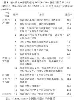指南报告质量采用国际实践指南报告规范(Reporting Items for practice Guidelines in HealThcare,RIGHT)评价,该工具包括7个领域(基本信息、背景、证据、推荐意见、评审和质量保证、资助与利益冲突声明及管理、其他方面)22个主条目,每个条目的评价分为"报告"和"未报告"两个选项,"报告"是指指南的相关内容完全或大部分符合该条目,"未报告"是指指南中无该条目相关信息[18,19],评价结果以整体报告率、单个领域报告率和单个条目报告率表示。指南的方法学质量采用中国临床实践指南评价体系(AGREE-China)评价,该工具是在指南研究与评价工具(Appraisal of Guidelines Research and Evaluation in Europe,AGREE)[20]的基础上,针对中国指南特点进行修改,强调中国证据,并经过验证的评分细则,有更好的适用性和可操作性。AGREE-China包括5个领域(科学性/严谨性、有效性/安全性、经济性、可用性/可行性和利益冲突)15个条目,根据被评价指南内容与条目内容的符合程度,每个条目评分范围为0~5分,0分为完全不符合,5分为完全符合,不同条目被赋予不同的权重[21],评价结果以整体得分、单个领域报告率和单个条目报告率表示。