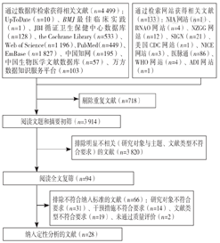 经初步检索获得文献4 632篇,剔除重复文献718篇,阅读文题和摘要后剔除文献3 820篇,然后通读94篇文献全文进行复筛,最终纳入28篇[9,12,19,20,21,22,23,24,25,26,27,28,29,30,31,32,33,34,35,36,37,38,39,40,41,42,43,44]文献,其中3篇[12,19,20]为指南,5篇[9,21,22,23,24]为专家共识,1篇[25]为临床决策,19篇[26,27,28,29,30,31,32,33,34,35,36,37,38,39,40,41,42,43,44]为系统评价。文献筛选流程见图1。
