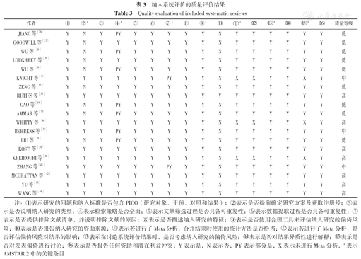 注:①表示研究的问题和纳入标准是否包含PICO(研究对象、干预、对照和结果);②表示是否提前确定研究方案及获取注册号;③表示是否说明纳入研究的类型;④表示检索策略是否全面;⑤表示文献筛选过程是否具备可重复性;⑥表示数据提取过程是否具备可重复性;⑦表示是否提供排除文献清单,并说明排除文献的原因;⑧表示是否描述纳入研究的特征;⑨表示是否使用合理工具来评估纳入研究的偏倚风险;⑩表示是否报告纳入研究的资助来源;⑪表示若进行了Meta分析,合并结果时使用的统计方法是否恰当;⑫表示若进行了Meta分析,是否评估偏倚风险对结果的影响;⑬表示在讨论系统评价结果时,是否考虑纳入研究的偏倚风险;⑭表示是否对结果异质性进行解释;⑮表示是否对发表偏倚进行讨论;⑯表示是否报告任何资助和潜在利益冲突;Y表示是,N表示否,PY表示部分是,X表示未进行Meta分析,a表示AMSTAR 2中的关键条目