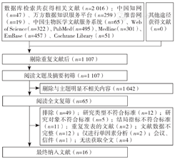 计算机检索共获得2 016篇文献,经查重后得到1 107篇,阅读文题摘要初筛得到65篇,再阅读全文复筛最终纳入16篇[8,9,10,11,12,13,14,15,16,17,18,19,20,21,22,23]文献。纳入研究发表时间为2008—2022年,总样本量为2 855例,其中中文文献10篇[8,10,11,12,13,14,16,20,21,22],英文文献6篇[9,15,17,18,19,23];期刊论文11篇[8,9,10,13,15,16,17,18,19,21,23],学位论文5篇[11,12,14,20,22],具体检索流程见图1。