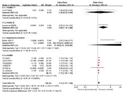 10项[8,11,12,13,16,18,19,20,21,23]研究报道了抑郁情绪对PD患者疼痛的影响,异质性检验结果显示I2=57%、P=0.01,采用随机效应模型进行Meta分析,结果显示,抑郁情绪是PD患者发生疼痛的危险因素〔OR=1.14,95%CI(1.07,1.22),P<0.000 1〕。考虑10项研究中采用的抑郁评估工具不同,对该结局指标进行亚组分析,共分为4个亚组。其中1项研究[13]采用汉密尔顿抑郁量表17(HAMD-17)进行抑郁评估,结果显示,抑郁情绪不是PD患者发生疼痛的危险因素〔OR=1.36,95%CI(0.22,8.54),P=0.74〕;1项研究[23]采用医院焦虑抑郁量表-抑郁子量表(HADS-D)进行抑郁评估,结果显示抑郁情绪是PD患者发生疼痛的危险因素〔OR=2.00,95%CI(1.10,3.64),P=0.02〕,2项研究[18,19]仅描述抑郁情绪,Meta分析结果显示,抑郁情绪不是PD患者发生疼痛的危险因素〔OR=27.89,95%CI(0.23,3 330.98),P=0.17〕;6项研究[8,11,12,16,20,21]采用HAMD量表进行评估,Meta分析结果显示,抑郁情绪是PD患者发生疼痛的危险因素〔OR=1.12,95%CI(1.09,1.16),P<0.000 01〕,见图4。