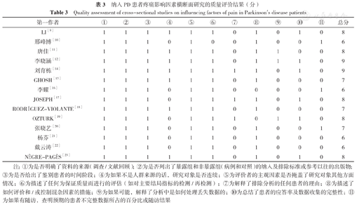 纳入PD患者疼痛影响因素横断面研究的质量评价结果(分)
