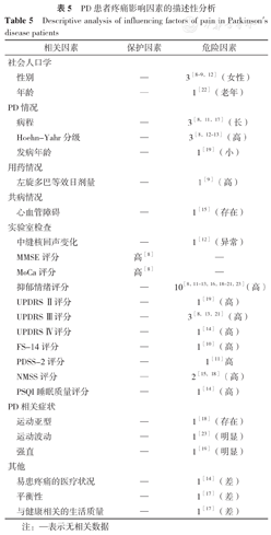 女性、病程长、抑郁情绪、运动障碍、Hoehn-Yahr分级高以及其他非运动症状(睡眠障碍、疲劳)程度重是PD患者疼痛的危险因素,未来需要更大样本、高质量研究进一步验证。