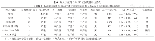 对纳入文献合并效应量的结局指标进行GRADE分级,结果显示,性别、NMSS评分2项结局指标为中等质量证据,病程、抑郁情绪、UPDRS Ⅲ评分3项结局指标为低质量证据,Hoehn-Yahr分级结局指标为极低质量证据。GRADE证据质量评价结果见表6。