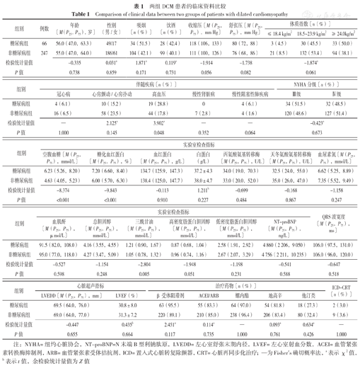 糖尿病组DCM患者高血压比例、空腹血糖、糖化血红蛋白、三酰甘油水平高于非糖尿病组,差异有统计学意义(P<0.05);两组患者年龄、性别、吸烟比例、饮酒比例、收缩压、舒张压、体质指数比例、伴随疾病(冠心病、心房颤动/心房扑动、慢性肾脏病、慢性阻塞性肺疾病)比例、NYHA分级(Ⅲ级、Ⅳ级)、实验室指标(血红蛋白、白蛋白、丙氨酸氨基转移酶、天冬氨酸氨基转移酶、血尿素氮、血肌酐、总胆固醇、高密度脂蛋白胆固醇、低密度脂蛋白胆固醇、NT-proBNP)、QRS波宽度、心脏超声指标(LVEDD、LVEF)、治疗药物(β受体阻滞剂、ACEI/ARB、螺内酯、地高辛、他汀类)比例、ICD-CRT比例比较,差异无统计学意义(P>0.05),见表1。