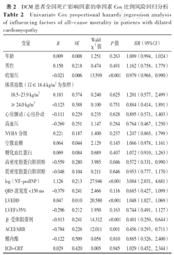 以全因死亡(赋值:是=1,否=0)为因变量,以年龄、收缩压、空腹血糖、糖化血红蛋白、高密度脂蛋白胆固醇、低密度脂蛋白胆固醇、LVEDD(以上赋值均为实测值)、NT-proBNP(赋值为经对数转换的实测值)、性别(赋值:男=1,女=0)、体质指数(赋值:≤18.4 kg/m2=1,18.5~23.9 kg/m2=2,≥24.0 kg/m2=3)、心房颤动/心房扑动(赋值:是=1,否=0)、高血压(赋值:是=1,否=0)、NYHA分级(赋值:Ⅲ级=1,Ⅳ级=2)、QRS波宽度(赋值:<150 ms=1,≥150 ms=2)、LVEF(赋值:≤35%=1,>35%=2)、β受体阻滞剂(赋值:用药=1,未用药=0)、ACEI/ARB(赋值:用药=1,未用药=0)、螺内酯(赋值:用药=1,未用药=0)、ICD-CRT(赋值:安置=1,未安置=0)进行单因素Cox比例风险回归分析,结果可见,收缩压、高密度脂蛋白胆固醇、NT-proBNP、LVEDD、β受体阻滞剂、ACEI/ARB是DCM患者全因死亡的影响因素(P<0.05),见表2。