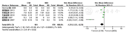共纳入了11篇[15,16,18,19,20,21,22,25,27,28,29]以2 hPG为指标的文献。异质性检验:I2=87%,P<0.1,采用随机效应模型进行Meta分析,结果显示,试验组老年T2DM患者2 hPG水平低于对照组,差异有统计学意义〔MD=-0.76,95%CI(-1.39,-0.14),P<0.05〕,见图3。