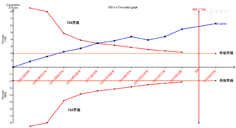两组FPG水平比较的TSA分析结果如图8所示,李思瓯等[20]之前研究的累积Z曲线不仅穿过了传统界值还跨过了TSA界值,可以提前获得肯定的结论,即CSII治疗能明显改善老年T2DM患者的FPG水平。之后纳入的研究样本量也达到了RIS,更加肯定了所得结论。