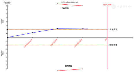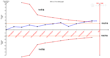 两组严重低血糖发生率比较的TSA分析结果如图11所示。纳入了3篇文献后,累积Z曲线穿过了传统界值,但是未跨过TSA界值且累积的信息量也未达到RIS,提示传统的Meta分析可能得到了假阳性结论,未来还需开展更多的试验以确证两种注射方法的安全性。