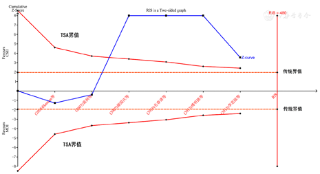 两组HbA1c水平比较的TSA分析结果如图10所示,裴泂等[15]之后的累积研究Z曲线穿过了传统界值和TSA界值,可以提前获得肯定的结论,即CSII治疗改善老年T2DM患者HbA1c的效果更好。