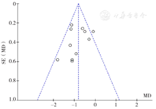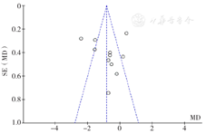 对主要结局指标的Meta分析森林图进行观察,发现2 hPG和HbA1c两项指标结果存在部分研究游离于整体趋势之外。因此采用逐一剔除法验证结果稳定性。对2 hPG的相关研究逐个剔除后进行分析,合并结果无明显变化,可认为结果稳定性较好。对HbA1c的相关研究进行敏感性分析,谢国庆等[16]的研究明显游离在整体趋势之外,剔除该项研究后,合并结果转变为两组改善HbA1c的效果无统计学差异〔SMD=-0.49,95%CI(-1.23,0.24),P=0.19〕,说明该指标的结果稳定性较差。