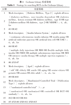 计算机检索Cochrane Library、PubMed、Embase、Medline、Scopus、Web of Science、中国知网(CNKI)、万方数据知识服务平台(Wanfang Data)、维普期刊资源整合服务平台(CQVIP)和中国生物医学文献数据库(SinoMed)中关于CSII治疗老年T2DM患者的随机对照试验(RCT)文献,检索时限从数据库建库至2021年12月。将所有检索词导入维普数据库中的"同义词"搜索找出近似词,查找英文MeSH词表和中文医学主题词表(CMeSH)获得检索词的正确表达方式,最后采用主题词结合自由词的方式检索数据库,辅以滚雪球方式检索所获文献的参考文献来补充相关文献。以Cochrane Library为例,检索策略详见表1。