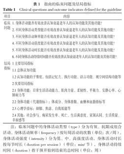 指南文献纳入标准:(1)截至检索日的最新版本指南;(2)推荐意见明确;(3)含对认知衰退老年人身体活动相关推荐意见。排除标准:(1)非中、英文指南;(2)直接翻译的国外指南或重复发表指南;(3)准则性文件或共识意见。系统评价文献纳入标准:(1)研究类型为系统评价或Meta分析;(2)PICO涉及内容符合上述检索策略。排除标准:(1)重复发表文献仅保留1篇;(2)无法获取全文,在联系作者3次后仍无法获取的文献;(3)非中、英文文献。由2名指南秘书组的成员根据纳入与排除标准独立对文献进行筛选,先后阅读题目、摘要、全文,如遇分歧由2人共同讨论或由第3位成员决定。
