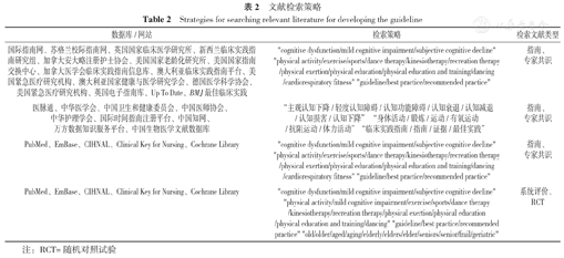 | PubMed、EmBase、CIHNAL、Clinical Key for Nursing、Cochrane Library | "cognitive dysfunction/mild cognitive impairment/subjective cognitive decline" "physical activity/exercise/sports/dance therapy/kinesiotherapy/recreation therapy/physical exertion/physical education/physical education and training/dancing/cardiorespiratory fitness" "guideline/best practice/recommended practice" | 指南、专家共识 |