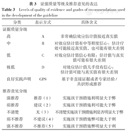 由指南秘书组的2名成员提取并核对可解答指南临床问题的证据及推荐意见,出现不一致时经由双方讨论或由第3位成员决定。纳入的证据体采用GRADE分级体系进行证据质量评价[27]。GRADE分级过程中考虑5个降级因素(偏倚风险、不一致性、不精确性、发表偏倚、间接性)和3个升级因素〔效应量大、混杂因素偏倚(负偏倚)、剂量反应关系〕。证据质量分为高、中、低、极低4级。此外,指南的一些重要领域未在既往文献中找到理想依据,则基于非直接证据或专家临床经验达成共识,即良好实践声明(good practice statement,GPS)[30]。