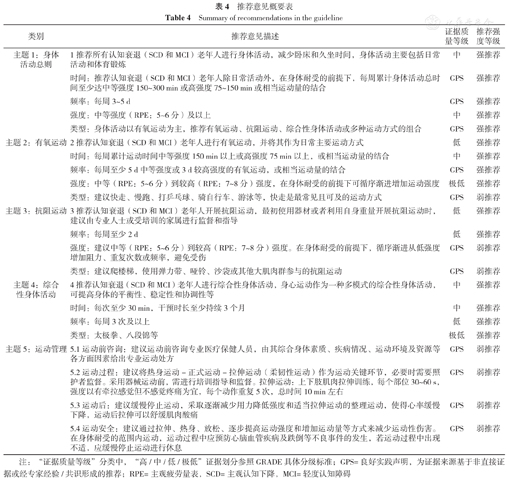 | 主题1:身体活动总则 | 1推荐所有认知衰退(SCD和MCI)老年人进行身体活动,减少卧床和久坐时间,身体活动主要包括日常活动和体育锻炼 | 中 | 强推荐 |