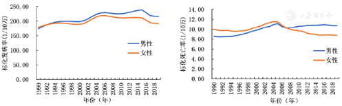 分性别看:2019年中国男性标化发病率和标化死亡率分别为216.38/10万、10.72/10万,相比于1990年分别增长23.94%、25.07%。2019年中国女性标化发病率为191.96/10万,相比于1990年增长7.03%;2019年中国女性标化死亡率为8.76/10万,相比于1990年降低12.74%。1990—2019年男、女性糖尿病标化发病率总体呈现波动式缓慢上升趋势,1993年以后男性标化发病率高于女性;1990—2019年男、女性糖尿病标化死亡率均在2004年前后达到最高值,2007年前女性标化死亡率高于男性,之后男性标化死亡率高于女性(图1)。