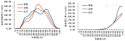 | 年份(年) | 粗发病率 | 标化发病率 | 粗死亡率 | 标化死亡率 |
