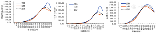 分年龄看:2019年YLL率、YLD率、DALY率总体随着年龄的增加呈明显上升趋势,但分别在85~89、75~79、85~89岁年龄组出现拐点。男性YLL率、YLD率、DALY率在各年龄组均高于女性,且分别从75~79、65~69、70~74岁年龄组开始大幅度超过女性(图3)。