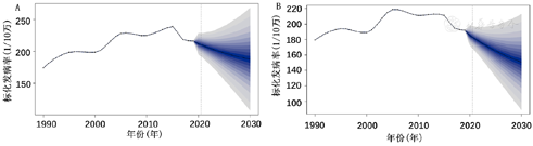 注:A为针对男性标化发病率的预测,B为针对女性标化发病率的预测