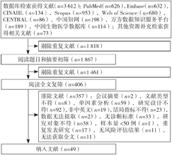 数据库初检获得文献3 612篇,追踪参考文献获取73篇,剔重后剩余1 867篇。经标题及摘要筛选后剩余406篇追溯全文,全文阅读后最终纳入49篇文献[5,14,15,16,17,18,19,20,21,22,23,24,25,26,27,28,29,30,31,32,33,34,35,36,37,38,39,40,41,42,43,44,45,46,47,48,49,50,51,52,53,54,55,56,57,58,59,60,61],文献质量均较高(NOS评分≥7分)。文献筛选流程见图1。纳入研究基本特征及质量评价结果见表2、表3。