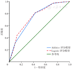 最终构建的Logistic风险预测模型为:Logit(P)=-1.349+0.575X1+0.278X2 +1.118X3 +0.482X4+0.864X5,X1、X2……X5分别为BMI、乳腺手术类型、腋窝手术类型、放疗、术后并发症。Logistic及Additive风险预测模型总分分别为0~34、5~11分,详见表5。