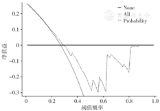 注:None表示所有样本是阴性,无干预,净获益为0;All表示所有样本是阳性,接受干预,净获益是斜率为负值的反斜线;Probability表示使用Logistic评分模型