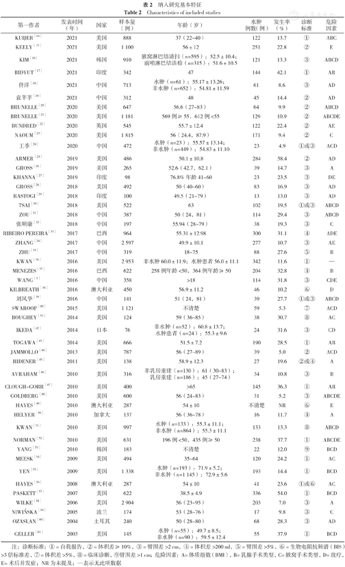 注:诊断标准:①=自我报告,②=体积差≥10%,③=臂围差>2 cm,④=体积差>200 ml,⑤=臂围差>5%,⑥=生物电阻抗频谱(BIS)>3倍标准差,⑦=体积差>5%,⑧=临床诊断,⑨臂围差>1 cm;危险因素:A=体质指数(BMI),B=乳腺手术类型,C=腋窝手术类型,D=放疗,E=术后并发症;NR为未提及;—表示无此项数据