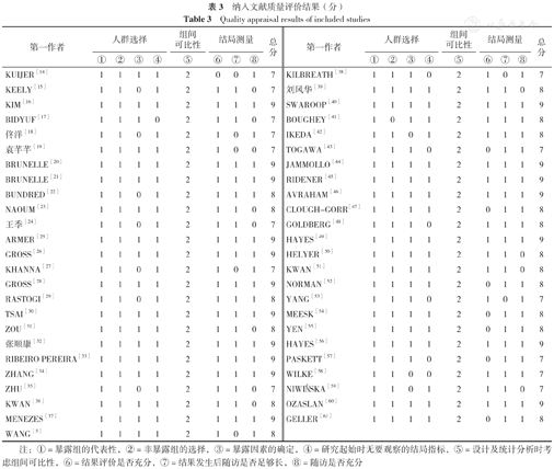 | 第一作者 | 人群选择 | 组间可比性 | 结局测量 | 总分 | 第一作者 | 人群选择 | 组间可比性 | 结局测量 | 总分 | ||||||||||