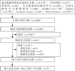 由2名研究者独立评价纳入研究的偏倚风险,并交叉核对结果。偏倚风险评价采用纽卡斯尔-渥太华量表(the Newcastle-Ottawa Scale,NOS),包括:评估研究对象的选择、组间可比性、结果3个方面,满分为9分,≥5分为高质量研究。