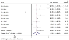 9篇文献[5,8,11,14,16,18,20,21,25]、3篇文献[8,11,23]、3篇文献[19,21,23]、6篇文献[11,14,17,18,22,24]、8篇文献[5,6,7,8,9,10,12,16]分别纳入术前PSA、穿刺阳性针数、穿刺神经周围侵犯、术前临床T分期、术后病理T分期,各文献间存在统计学异质性(I2>50%,P<0.1),采用随机效应模型进行Meta分析,结果显示,术前高PSA、穿刺神经周围侵犯、术前高级别临床T分期、术后高级别病理T分期是我国人群前列腺癌根治术后发生PSM的危险因素〔OR=1.77,95%CI(1.18,2.65),P=0.006;OR=5.83,95%CI(2.05,16.59),P=0.001;OR=2.17,95%CI(1.06,4.42),P=0.033;OR=4.30,95%CI(2.43,7.63),P<0.001〕;尚不能认为穿刺阳性针数对我国前列腺癌根治术后发生PSM有影响,见图2,图3,图4,图5,图6。