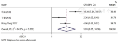 | 穿刺神经周围侵犯 | [19] | 随机效应模型 | 5.83(2.05,16.59) | 0.001 | 固定效应模型 | 3.79(2.30,6.24) | <0.001 |