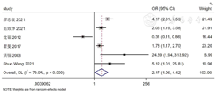 | 穿刺阳性针数 | 3[8,11,23] | 84.3 | 0.002 | 随机效应模型 | 2.17(0.98,4.80) | 0.057 |