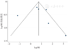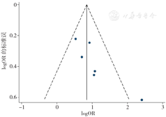 使用漏斗图法和Egger's检验对纳入研究数较多的Meta分析进行偏倚分析,结果显示,术前PSA(t=2.84,P=0.025)、术后病理T分期(t=3.43,P=0.014)和术后Gleason评分(t=2.82,P=0.048)的漏斗图分布不对称,存在发表偏倚;术前临床T分期漏斗图分布对称(t=0.32,P=0.764),不存在发表偏倚。以上结果表明本研究纳入的文献存在一定的发表偏倚,这可能与各个危险因素纳入的研究数量较少相关,见图10,图11,图12,图13。