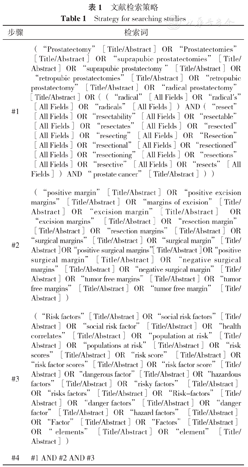 计算机检索PubMed、Embase、Cochrane Library、Web of Science、中国知网(CNKI)、万方数据知识服务平台(Wanfang Data)、中国生物医学文献数据库(CBM)和维普网(VIP),搜集前列腺癌根治术后PSM危险因素的相关文献,检索时限均从建库至2022-03-01。此外,将纳入研究的参考文献进一步检索,以补充获取相关文献。中文检索词包括:前列腺癌根治术、根治性前列腺癌切除术、切缘阳性、阳性手术切缘、危险因素、影响因素等;英文检索词包括:radical prostatectomy、prostatectomy、positive surgical margin、risk factors等。采用主题词与自由词结合的方式进行检索。以PubMed为例,具体检索策略见表1。