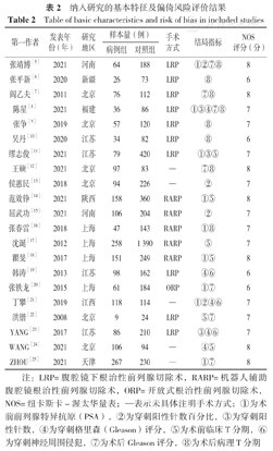由2位研究者独立筛选文献、提取数据并交叉核对,如有争议,咨询第三方协助判断是否纳入。文献筛选时首先阅读文题和摘要,在排除明显不相关的文献后,进一步阅读全文以确定是否纳入。资料提取内容包括:第一作者、发表年份、研究地区、样本量、手术方式、结局指标〔术前前列腺特异抗原(PSA)、穿刺阳性针数百分比、穿刺阳性针数、穿刺格里森(Gleason)评分、术前临床T分期、穿刺神经周围侵犯、术后Gleason评分、术后病理T分期〕、偏倚风险评价的关键要素。