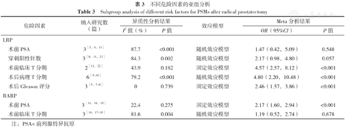 针对不同的手术方式进行亚组分析,结果显示,术前高级别临床T分期〔OR=4.57,95%CI(2.57,8.12),P<0.001〕、术后高级别病理T分期〔OR=4.80,95%CI(2.20,10.48),P<0.001〕、术后高Gleason评分〔OR=2.46,95%CI(1.57,3.86),P<0.001〕是采用腹腔镜下根治性前列腺切除术(LRP)方式进行手术的前列腺癌患者发生PSM的危险因素;术前高PSA〔OR=2.17,95%CI(1.60,2.94),P<0.001〕是采用机器人辅助腹腔镜根治性前列腺切除术(RARP)方式进行手术的前列腺癌患者发生PSM的危险因素,见表3。